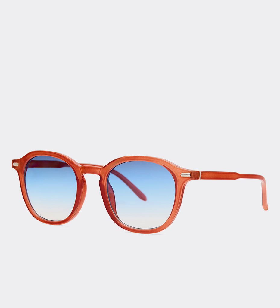 - Kwadratowe okulary Munich Red z filtrem UV400. Intensywne pomarańczowe oprawki i klasyczny kształt tworzą nowoczesny, modowy look, który dodaje energii i charakteru codziennym miejskim stylizacjom.