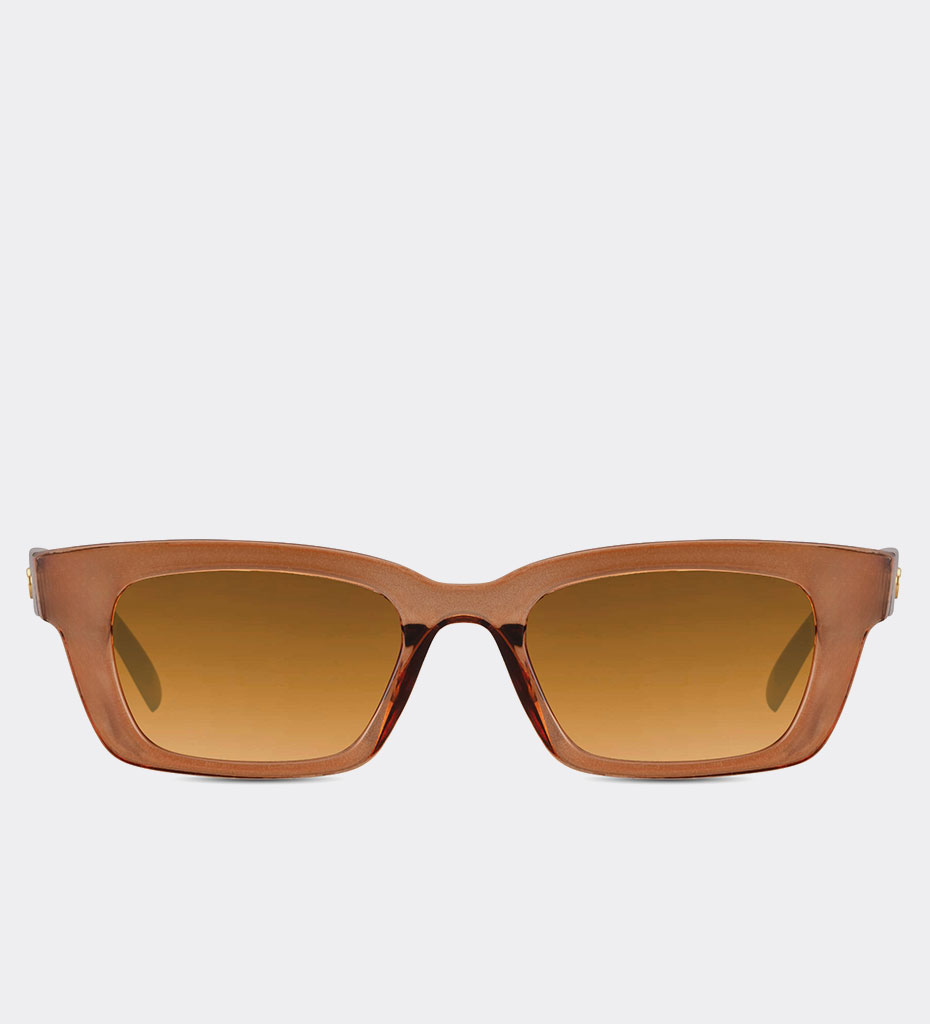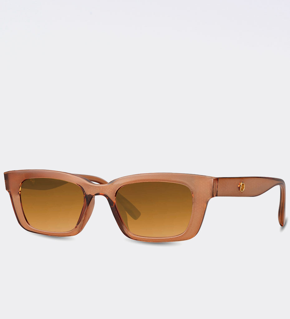 - Prostokątne okulary przeciwsłoneczne o minimalistycznej formie i ciepłym odcieniu oprawek. Model wyposażony w soczewki z filtrem UV, chroni oczy przed promieniowaniem. Lekkie, wygodne i uniwersalne – idealne do miejskich stylizacji i letnich wyjazdów.